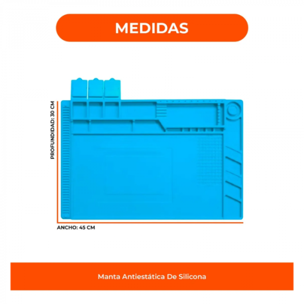 Con medidas de 30 x 45 cm, ofrece el espacio ideal para trabajar cómodamente con celulares y otros dispositivos electrónicos. Su peso de 632 gramos aporta estabilidad, y el color azul mejora la visibilidad de tornillos y componentes.