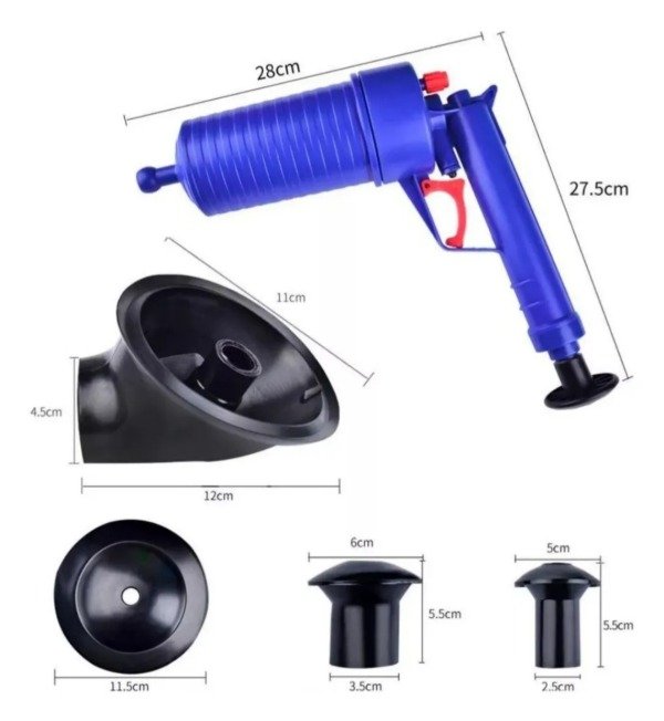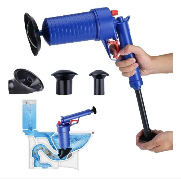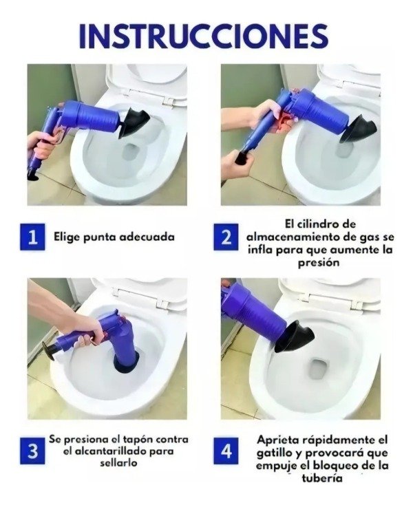 Gracias a su potente descarga de aire, libera atascos en segundos en duchas, inodoros, bachas y todo tipo de desagües, convirtiéndose en una herramienta imprescindible para el hogar.
